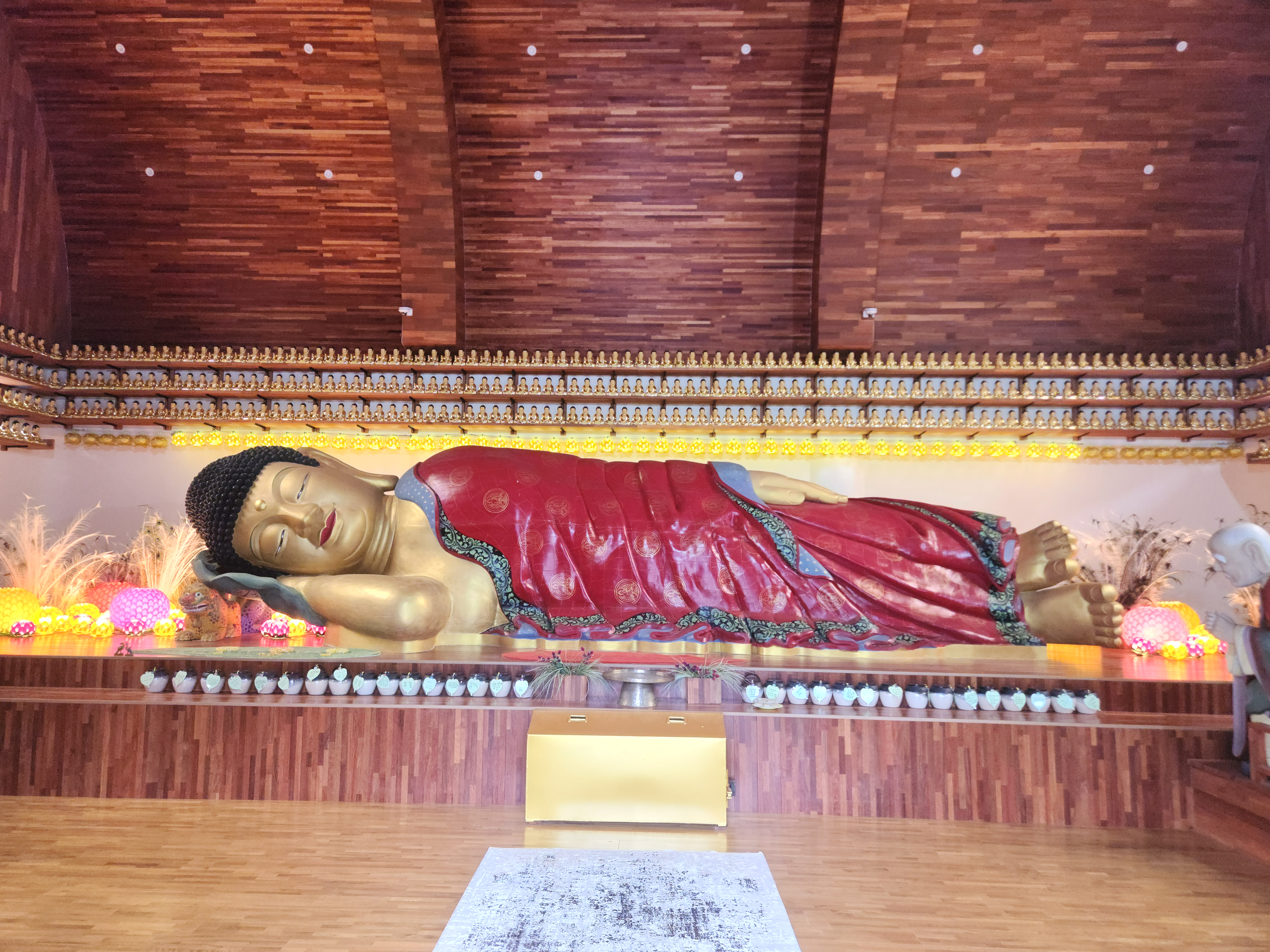 - 둘째, 사찰 경내에는 **길이 약 12m, 높이 약 3m에 달하는 누워있는 목불상(와불·臥佛상)**이 있습니다. 인도네시아 향나무로 제작되었고, 세계 기네스북에도 올라간 기록이 있다고 소개되는 만큼 규모 면에서 상당한 볼거리입니다.